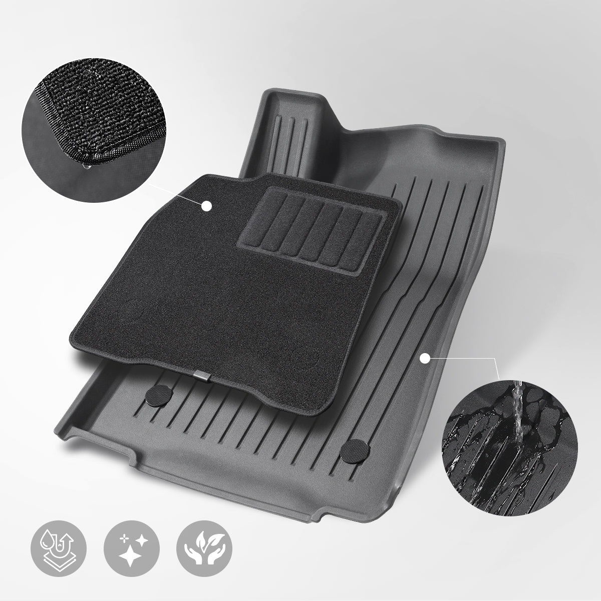 · Dual-Layer Design: Eco-friendly waterproof TPE bottom layer. Along with a dust-resistant woven carpet floor mat on the top.