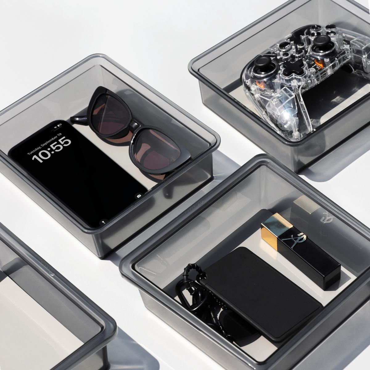 · Elegant, smoke gray and translucent design allows light in. Makes your essentials easy to access at night