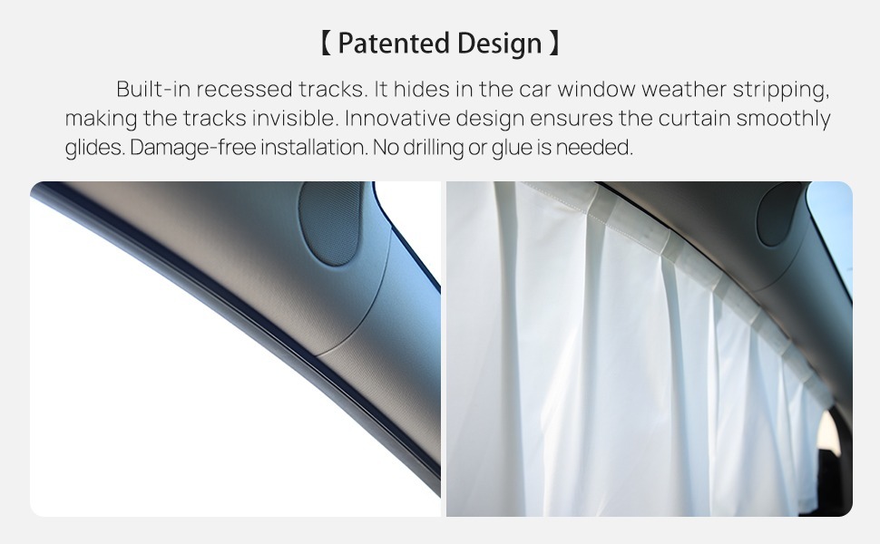 ·【Patented Design】Built-in recessed tracks. It hides in the car window weather stripping, making the tracks invisible. Innovative design ensures the curtain smoothly glides. Damage-free installation. No drilling or glue is needed