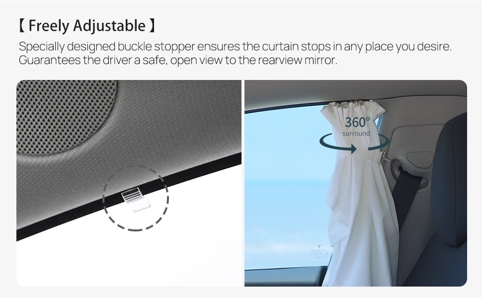 ·【Freely Adjustable】Specially designed buckle stopper ensures the front curtain stops in any place you desire. Guarantees the driver a safe, open view to the rearview mirror